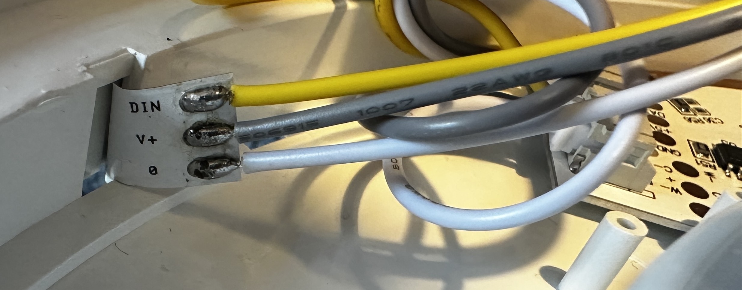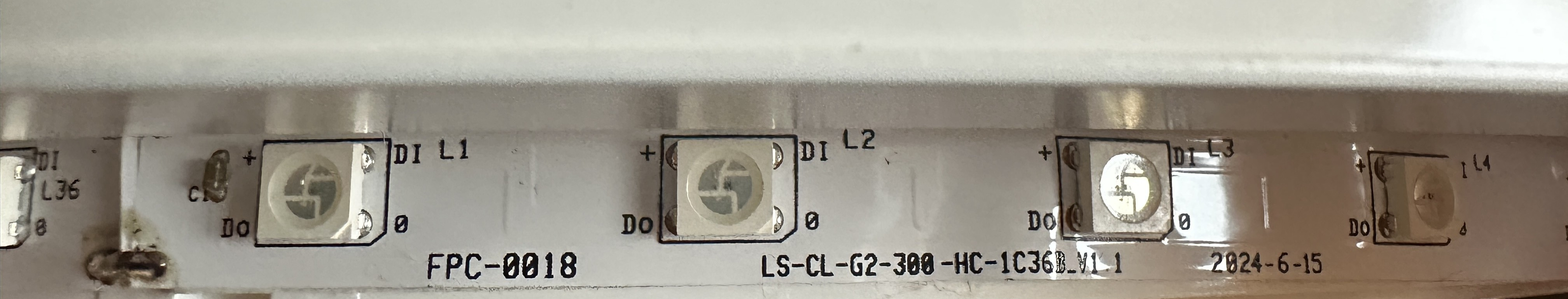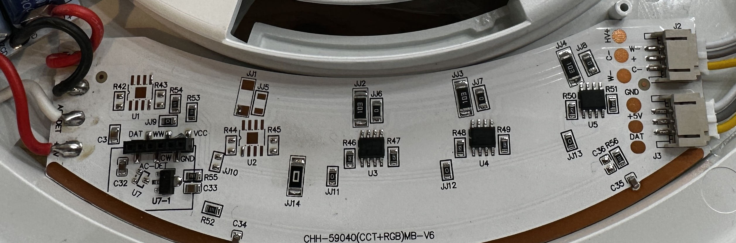 After removing the CBU module from the pin header, the silkscreen labels next to the connector become visible. Both the pin header and the corresponding connector on the PCB are labeled with Z, DAT, WW, CW, GND, and VCC. Using continuity tests, these signals can be traced across the PCB. The Z pin does not appear to be connected anywhere. The DAT pin is directly connected to the DIN input of the RGB LED strip, specifically to the first RGB LED in the chain (L36). The RGB strip is daisy-chained (DIN → DOUT → DIN …), which strongly indicates a WS2812-style single-wire protocol.